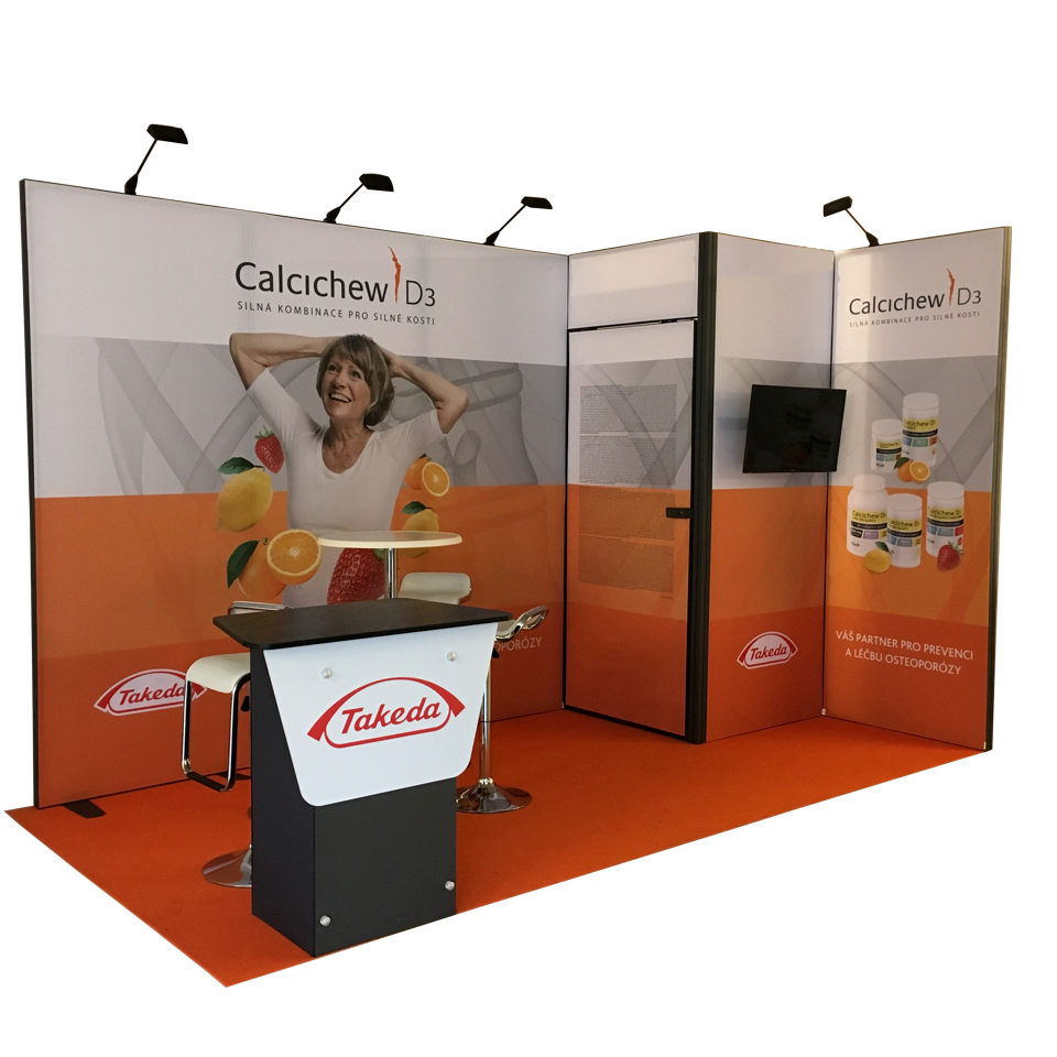Plnohodnotná HI-Tech výstavná expozícia. Ide o kombináciu precízne spracovaných kovových rámov a vymeniteľnej textilnej grafiky vo fotokvalite. ... Expozícia je určená pre klienta, ktorý preferuje čisté línie ostrých tvarov a jedinečnosť. Stánok je ideálny pre stredné a veľké plochy s možnosťou úpravy tvaru a veľkosti pre menšie expozície. Rýchla finančná návratnosť oproti bežným stánkom. Štandardná výška je 2,5m, 3m, 4m, 5m, 6m. Stánok je balený v plastových kufroch. Doplnky sú efektné premostenie a strechy, uzamykateľné zázemie, presvetlené panely a fixácia pre malé a veľké LCD monitory. 100% kvalita made in Germany.