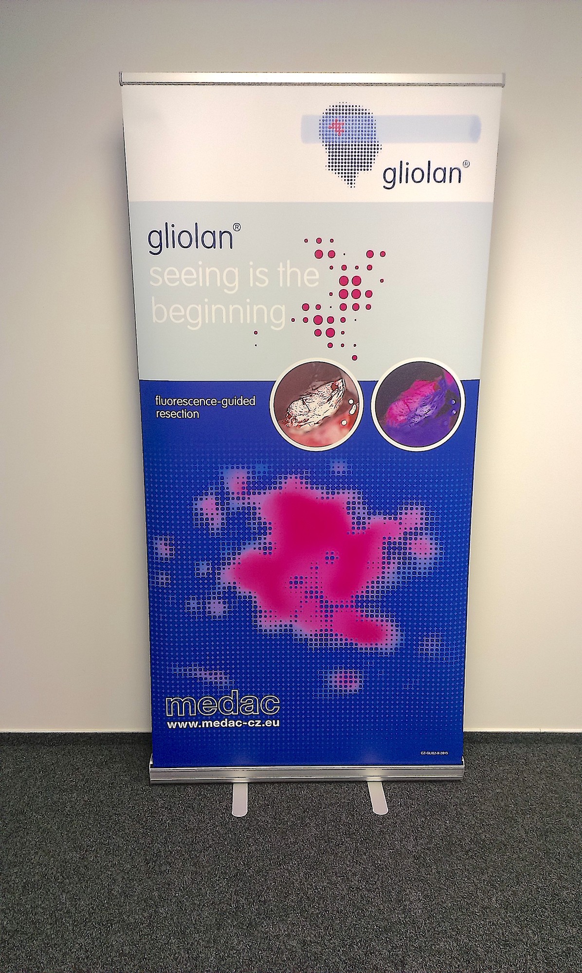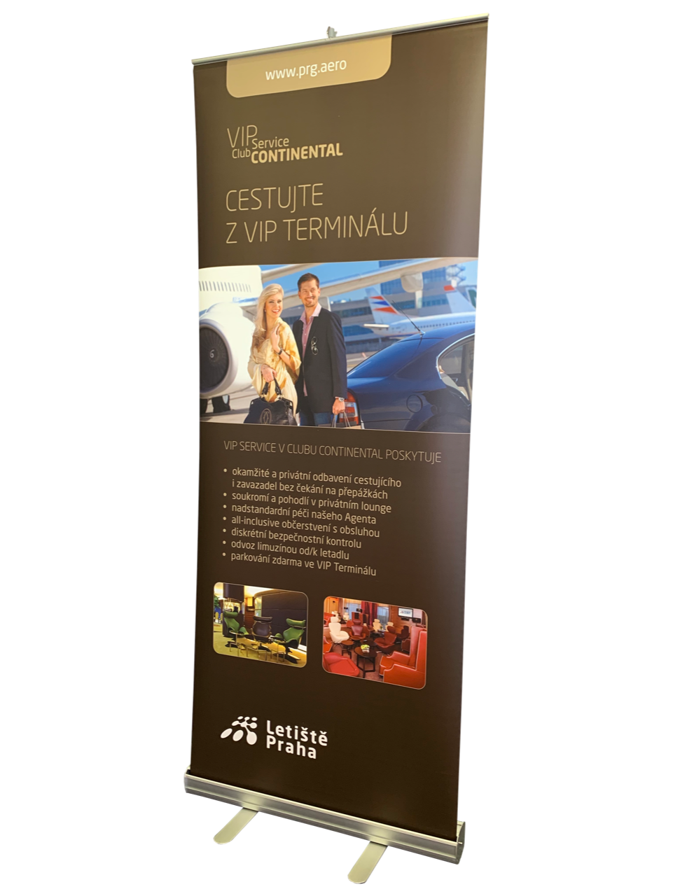 Rollup s navíjacím mechanizmom a banerovým panelom. Balený v nylonovej taške. Nejlacnejší variant rollupu.