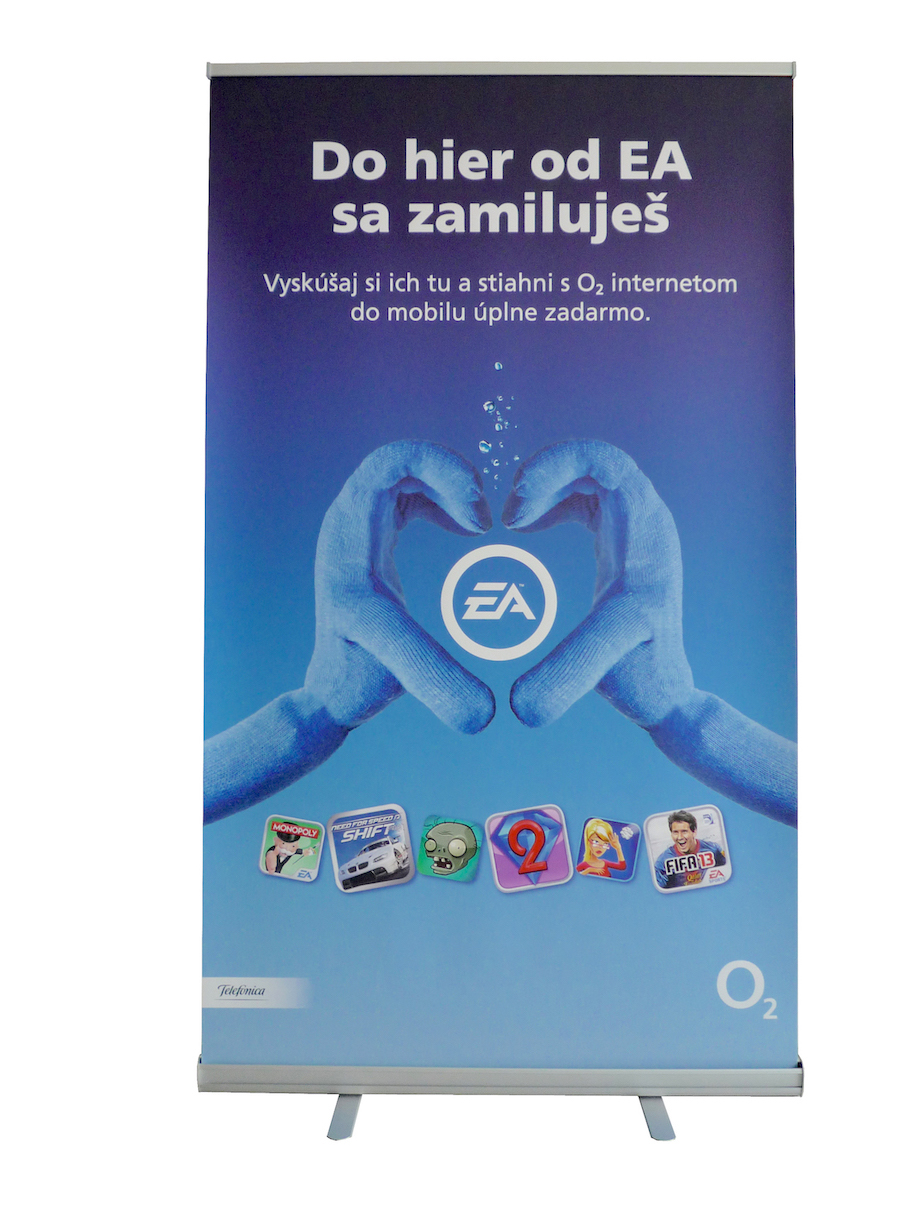 Rollup s navíjacím mechanizmom a banerovým panelom. Balený v nylonovej taške. Nejlacnejší variant rollupu.