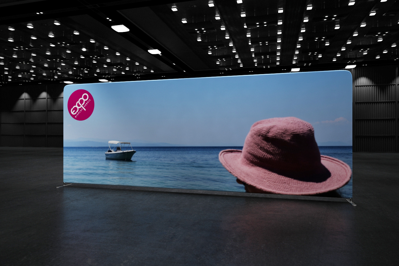 Prezentačnú stenu tvorí strečový panel navlečený na trubkovú hliníkovú konštrukciu pomocou zipsu.