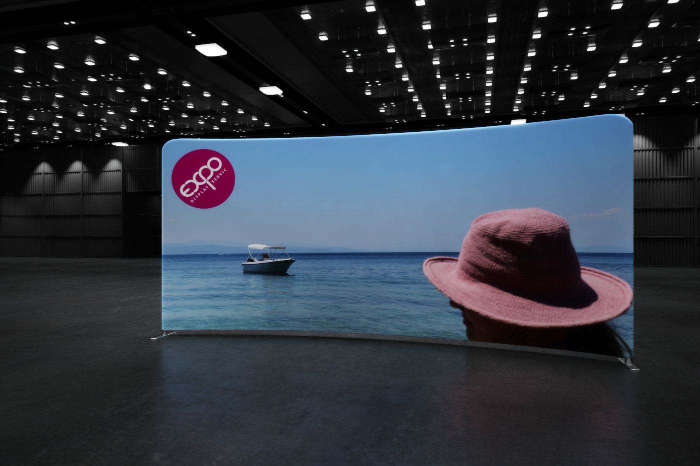 Prezentačnú stenu tvorí strečový panel navlečený na trubkovú hliníkovú konštrukciu pomocou zipsu.