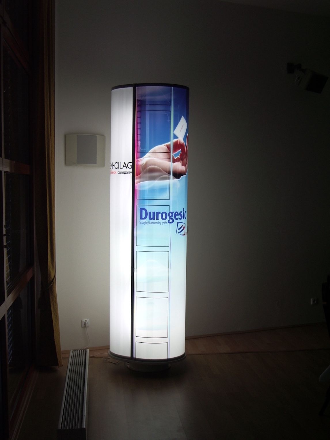 Hlíníková rozkladacia pop up konštrukcia s troma magnetickými panelmi. Roztočte stĺp pomocoou motora a spravte prezentáciu neprehliadnuteľnou. Stĺp je zabalený v plastovom tubusue s rúčkou. Motor je zabalený samostatne v kartónovej krabici.